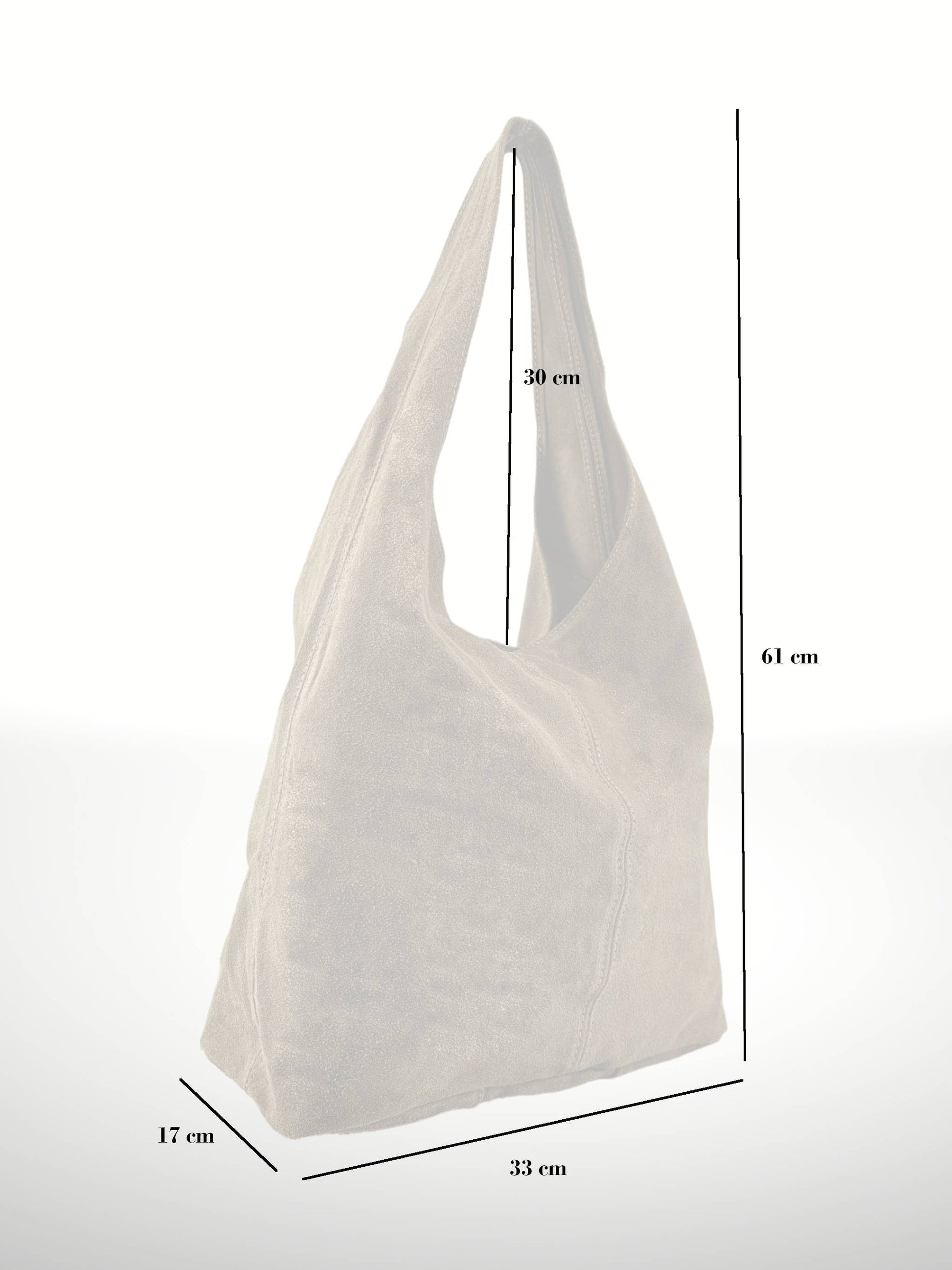 Exterior: Genuine suede leather, soft to the touch and resistant, with a refined finish. Interior: Large compartment without pockets, offering greater capacity and simplicity. Additional details: Top zip closure for added security and convenience. Handles: Single handle integrated into the design, ideal for carrying on the shoulder comfortably. Size: Spacious, perfect for everyday use or for casual outings.