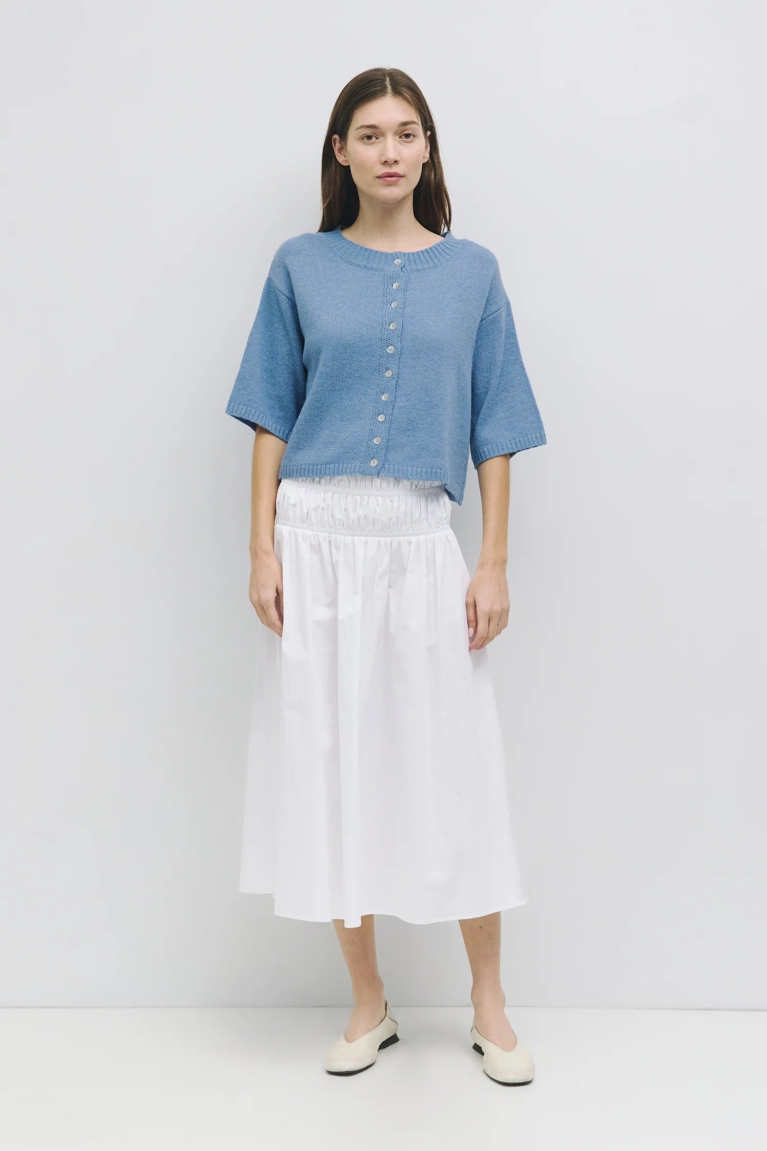 The Stacey Cardigan is a lightweight, half-sleeve cardigan with a relaxed fit, ideal for layering over tops and tanks. Features a wide neck, shell button closure, and ribbed trim.
